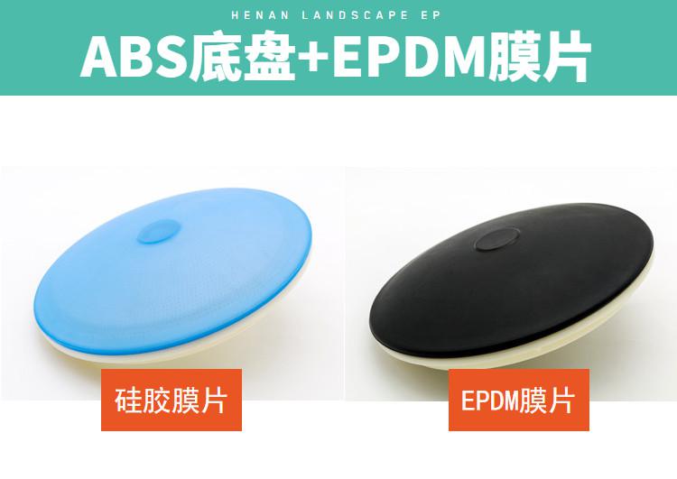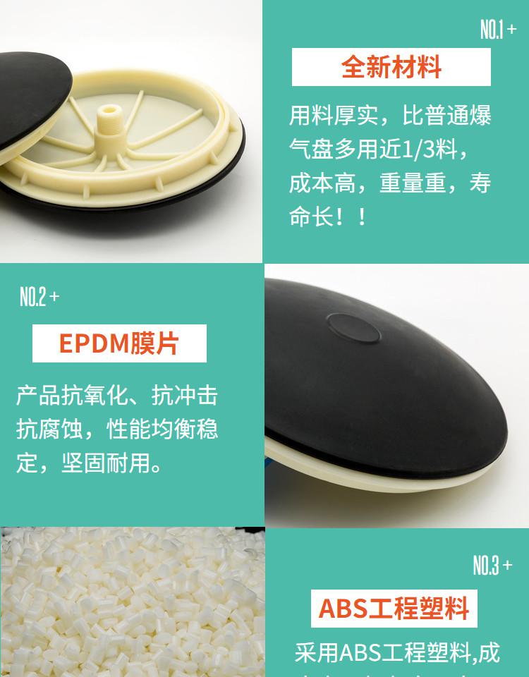 曝氣盤是膜式微孔曝氣產品。采用ABS工程塑料為底盤、托板,布氣膜片由三元乙丙膠(EPDM)材料制成,曝氣裝置由曝氣器、調節器、連接件和布氣管道、三通、四通、彎頭等管件連接組成。