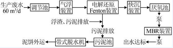 將原有調(diào)節(jié)池與缺氧池合并為新的調(diào)節(jié)池,在新調(diào)節(jié)池內(nèi)設(shè)置鼓風(fēng)曝氣系統(tǒng),在充分調(diào)節(jié)水質(zhì)水量的同時(shí),保證油類及懸浮物等污染物不會(huì)上浮;出水經(jīng)地上泵提升至氣浮裝置,在氣浮裝置內(nèi)進(jìn)行部分加壓溶氣氣浮預(yù)處理,去除廢水中大部分油類污染物、大量懸浮物SS等,以減少后續(xù)電解還原Fenton電極板清洗頻次,并降低后續(xù)處理負(fù)荷。氣浮裝置出水自流進(jìn)入電解還原Fenton裝置,通過(guò)外加電場(chǎng)作用該廢水,由于該廢水中含Cl-質(zhì)量濃度高、導(dǎo)電性良好,外加電場(chǎng)后,聯(lián)合化學(xué)藥劑共同作用,化學(xué)反應(yīng)劇烈,可對(duì)廢水中大分子有機(jī)污染物進(jìn)行氧化分解;電解還原Fenton裝置出水自流進(jìn)入快沉裝置,通過(guò)調(diào)節(jié)pH使大量污泥沉淀;快沉裝置上清液自流進(jìn)入?yún)捬醭兀ㄟ^(guò)厭氧微生物的新陳代謝作用去除廢水中難降解的有機(jī)污染物;厭氧池出水經(jīng)地上泵提升至MBR裝置,通過(guò)好氧微生物的作用進(jìn)一步降解廢水中的有機(jī)污染物,同時(shí)利用MBR膜組件的截留功能維持MBR裝置內(nèi)較高的污泥濃度,以增強(qiáng)系統(tǒng)的耐沖擊負(fù)荷能力;MBR裝置出水經(jīng)出水泵抽至出水桶,達(dá)標(biāo)后納管排放。