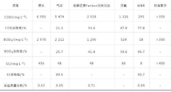 調(diào)試初期,對(duì)電解還原Fenton工藝的反應(yīng)電壓、電流及加藥量進(jìn)行了調(diào)試,對(duì)厭氧池采用接種化糞池污泥進(jìn)行接種,對(duì)MBR裝置采用洞頭區(qū)市政污水處理廠污泥濃縮池的污泥進(jìn)行接種。經(jīng)過(guò)近半年的試運(yùn)行,采用該組合工藝處理該廢水,氣浮池、電解還原Fenton、厭氧及MBR設(shè)計(jì)COD去除率分別為25%、50%、65%、70%。具體進(jìn)、出水水質(zhì)及各工藝段去除率見表2。